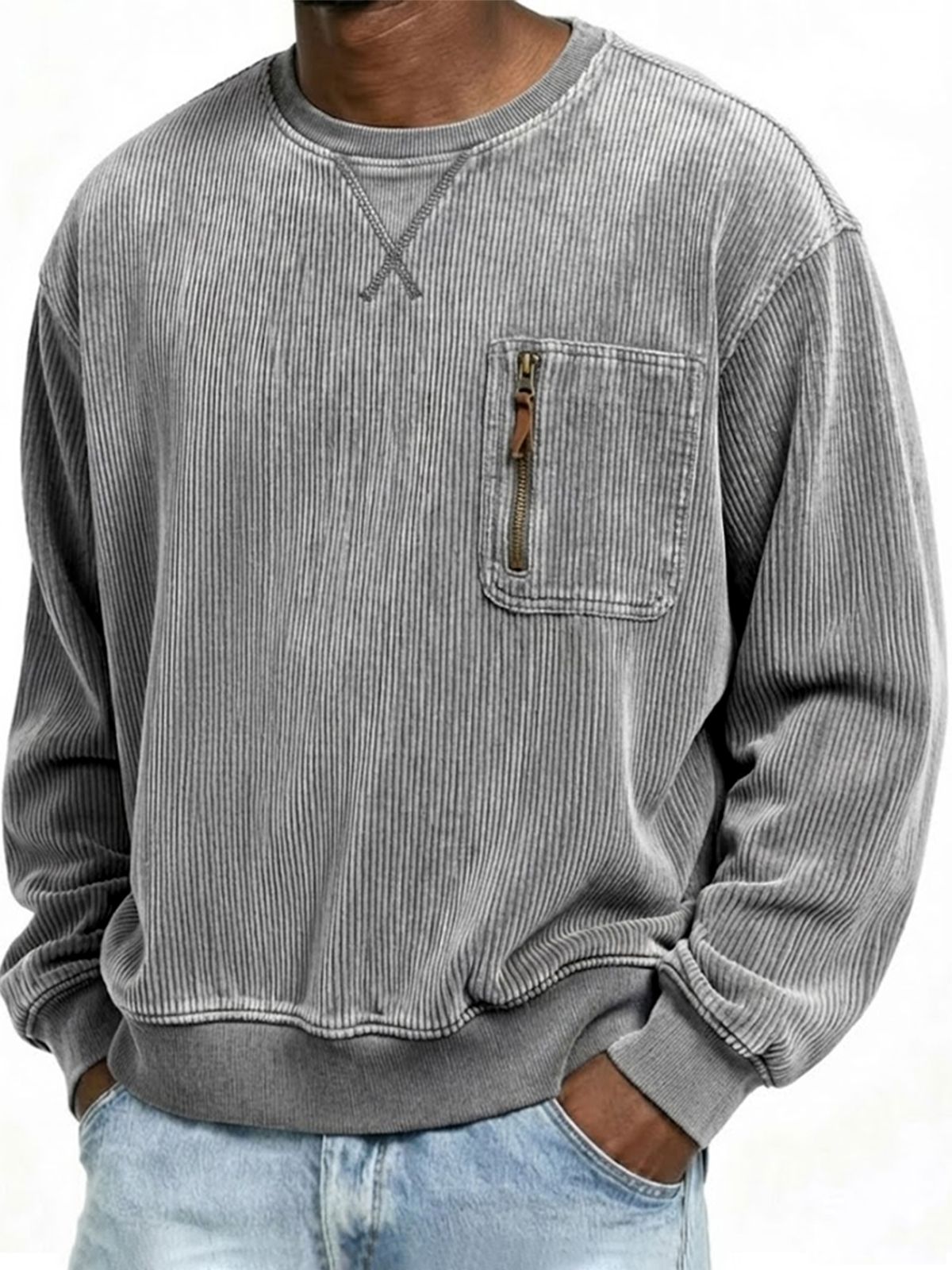 Men's Vintage Corduroy Embroidered Patchwork Basic Pullover Crew Neck Sweatshirt with Cargo Zipper Pockets