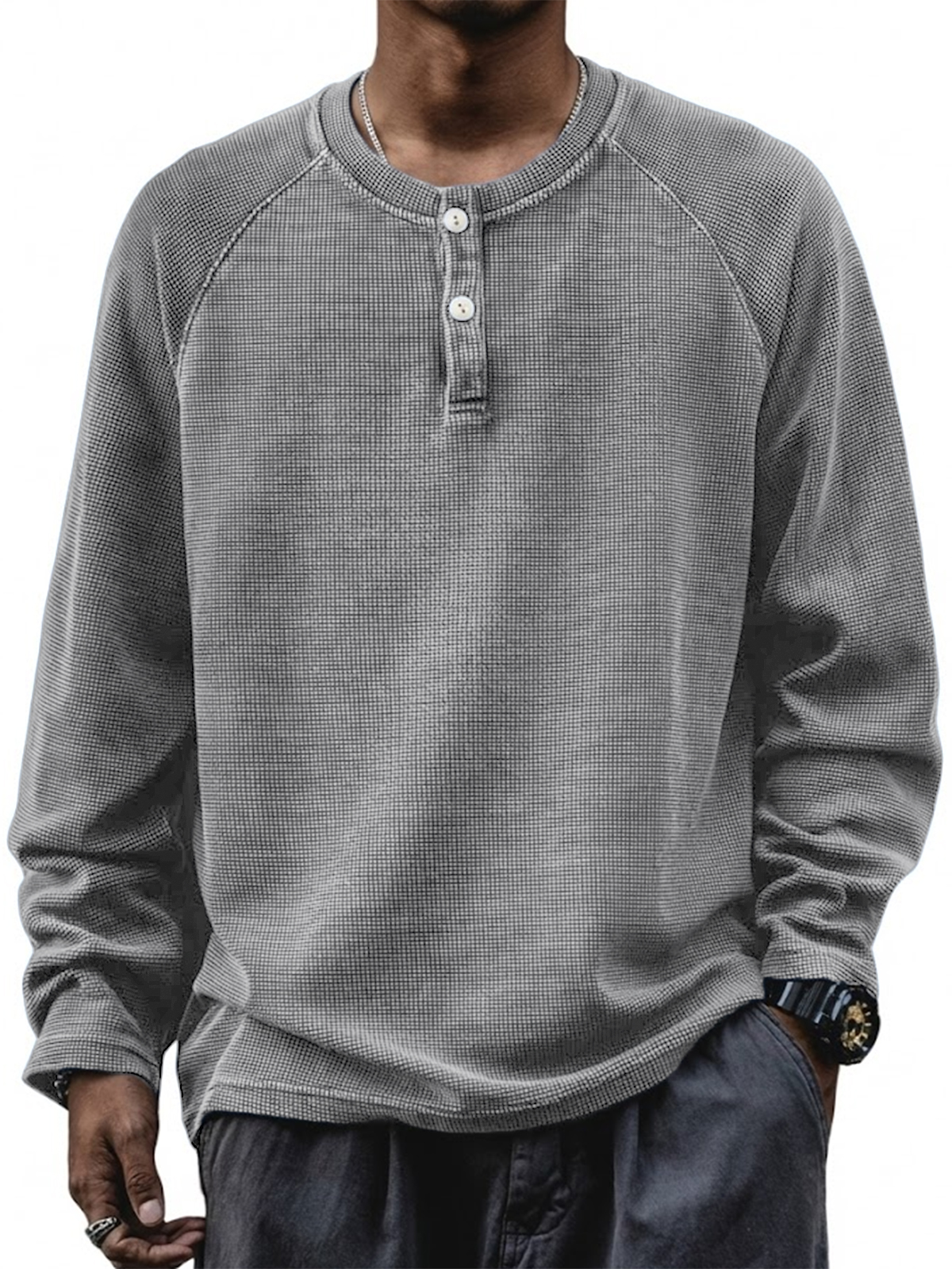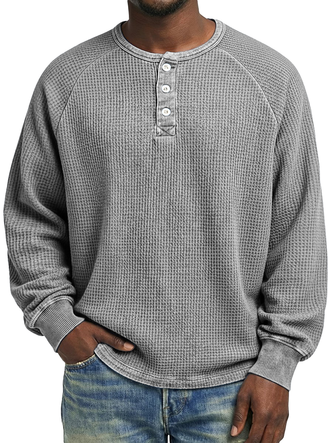 Men's Casual Raglan Sleeve Waffle Knit Comfortable Long-sleeved Henley Shirt