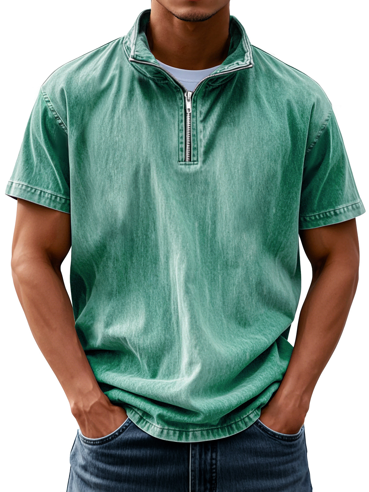 Men's Retro Casual Stand Collar Quarter-Zip Short Sleeve T-Shirt