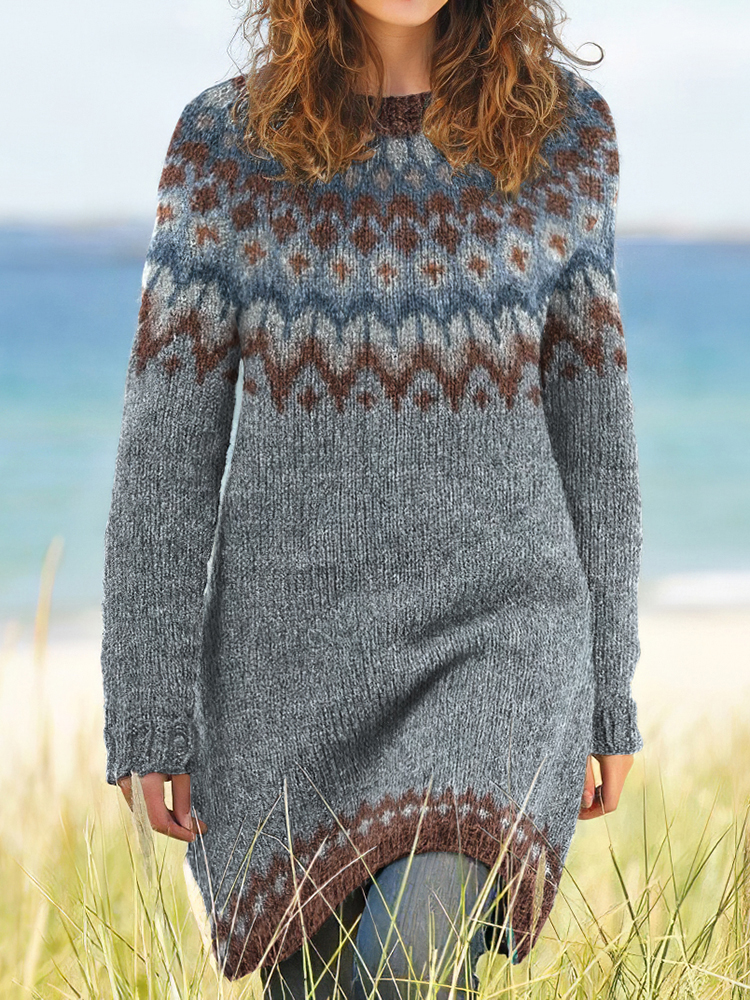 Fairman Island Contrast Wavy Jacquard Long Sleeve Sweater Midi Dress